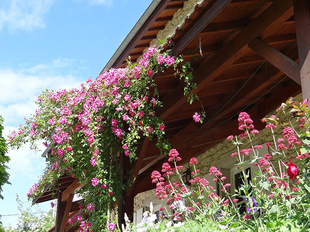 Dans ce jardin, à Trept en Isère, 250 variétés différentes de roses anciennes et modernes se déclinent dans un écrin de vivaces et d'arbustes. En entrant, plusieurs grimpants habillent les murs de la maison : la généreuse Noisette 'Mme Alfred Carrière', l'Hybride de Bourbon 'Le Bienheureux de la Salle' qui a retrouvé son vrai nom, la magnifique 'Ghislaine de Féligonde', et 'Mme Solvay’, la belle liane ébouriffée du regretté André EVE.