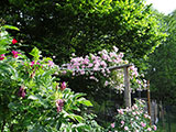 'Pink Bells' croule sous les fleurs, ainsi que 'La Fraîcheur' qui porte bien son nom. De nombreux rosiers botaniques, le Portland 'Jacques Cartier', la gallique 'Dis moi qui tu es', le bien nommé !… la capiteuse Damas 'Ispahan', le rare Wichura 'Casimir Moullé', les moussues 'Salet', 'William Lobb', l'alba 'Chloris', les nombreux Pemberton 'Felicia', 'Cornelia', 'Moonlight' ,'Penelope' etc… tous cohabitent avec vivaces et arbustes.